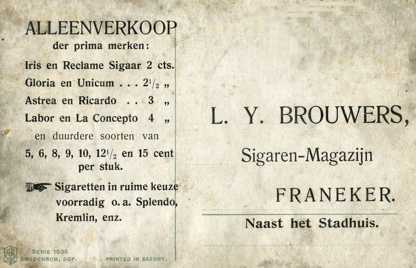Beschrijving: | Reklame kaart voor sigarenmagazijn L.Y Brouwers ( Lammert Ysbrands ) Hij woonde zelf ernaast op nummer 7. |