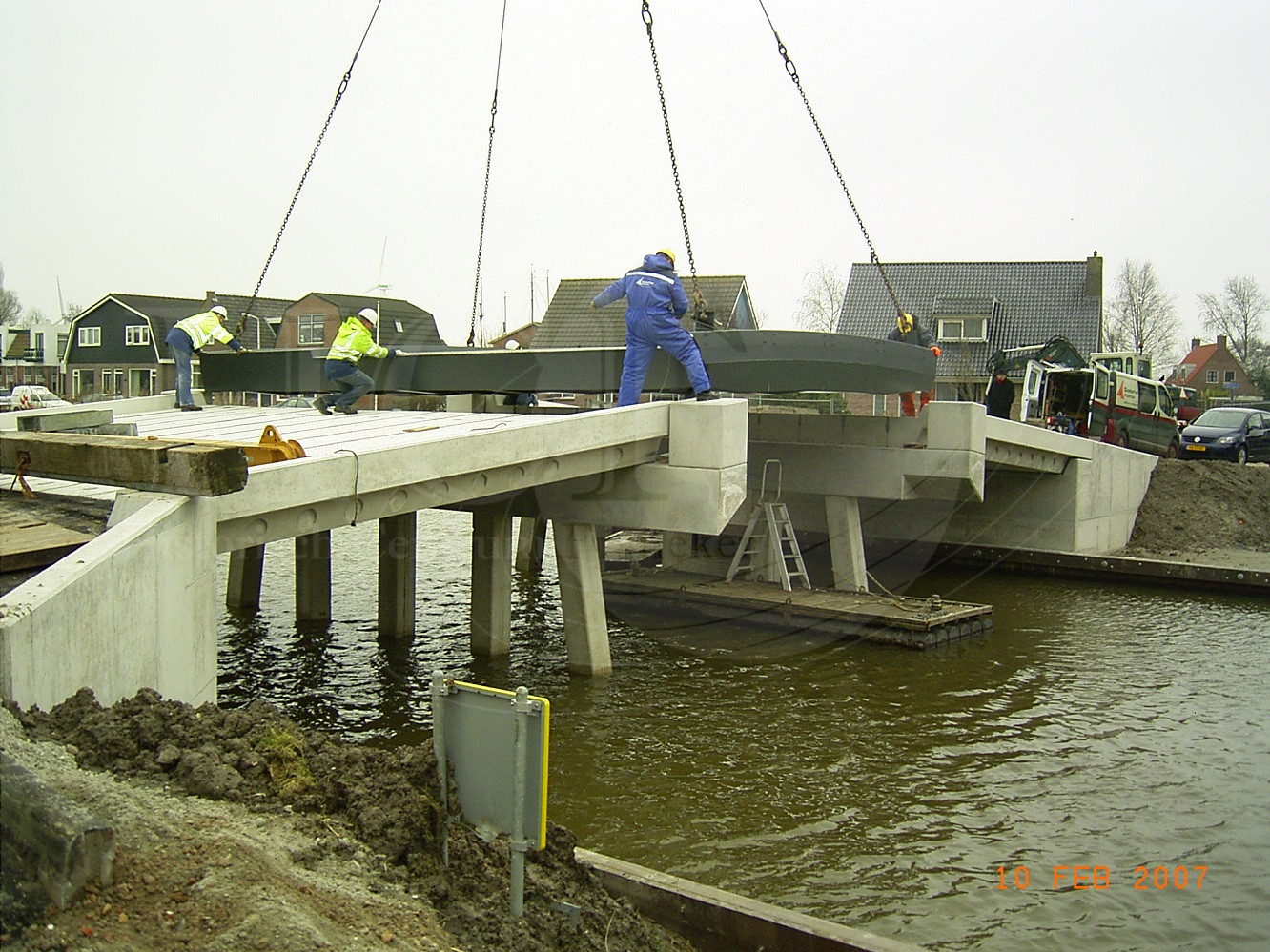 Beschrijving: | Het brugdeel van de nieuwe paardenbrug wordt ingetakeld. |