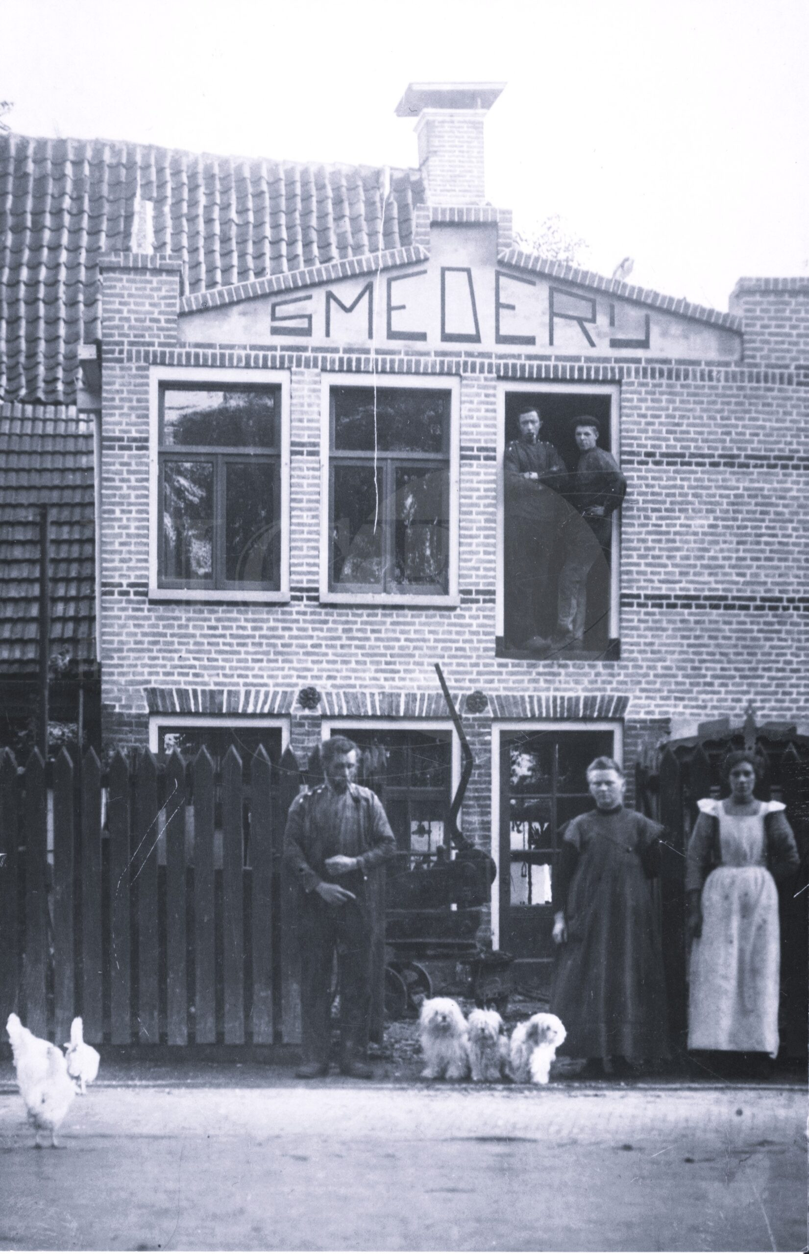 | Beschrijving: | Achterzijde van Schilbanken 27 met waarschijnlijk de smederij van Hette Gerbens Sikkema, gezien vanaf de Zuiderkade. |