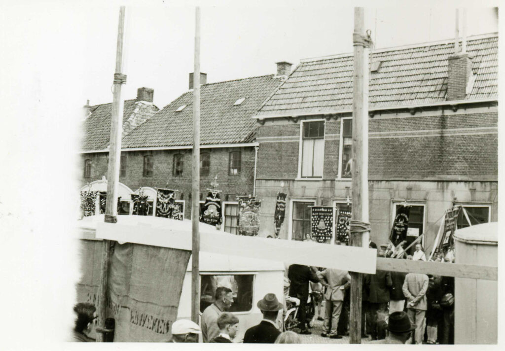Beschrijving: | Feest. Optocht met vaandels. Waarschijnlijk voor dat kaatswedstrijd "De Bond" begint op het Sjûkelân. |