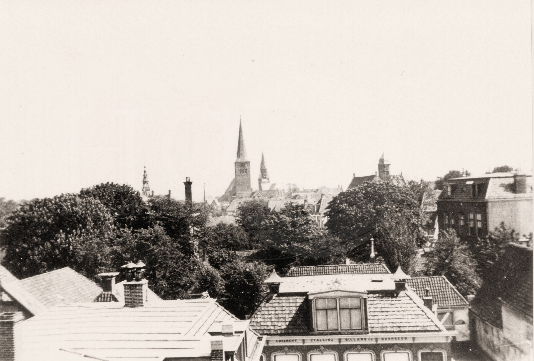 Beschrijving:Zicht over Franeker. Onder nog net Café "Het Hof van Holland ". Links onder het kantoor van de gasfabriek.