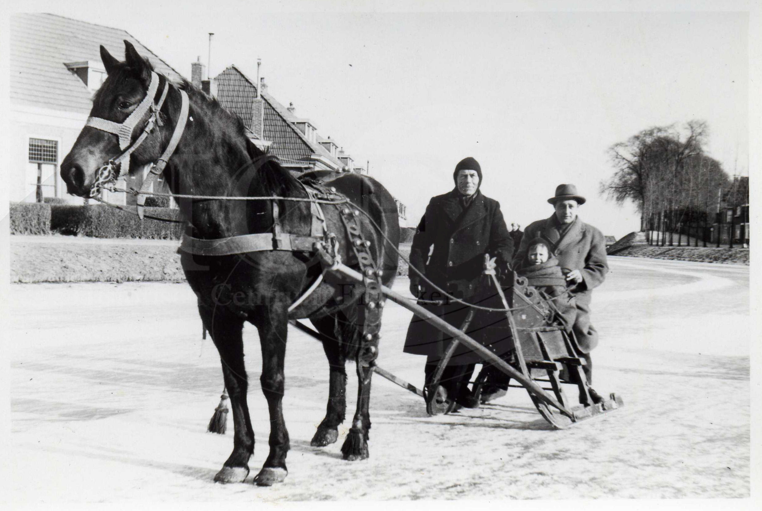 | Beschrijving: | Winter. Ijs. Een paard trekt een arrenslee met 2 mannen en een kind |