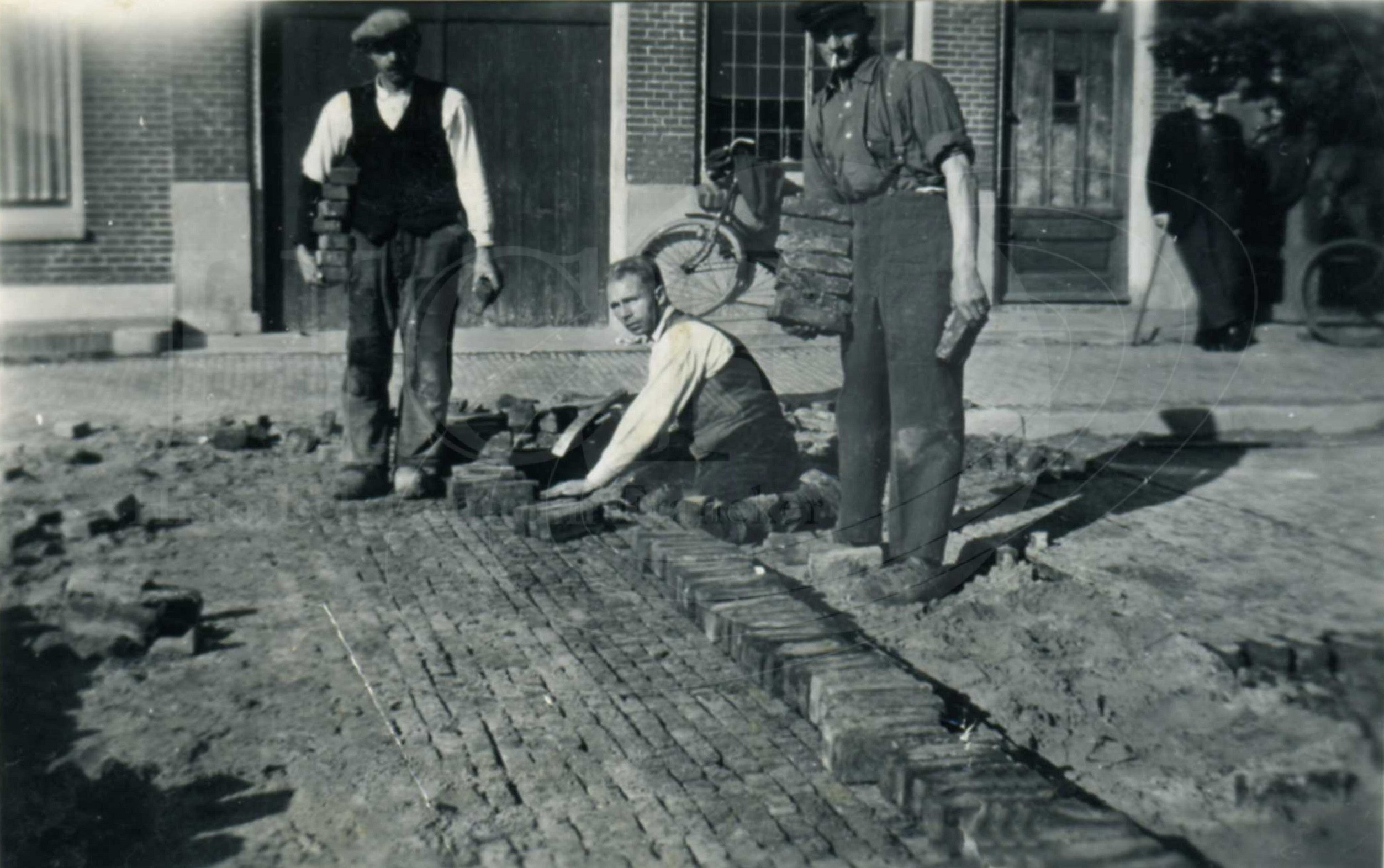 Beschrijving:Stratenmakers zijn aan het werk voor Turfkade 8