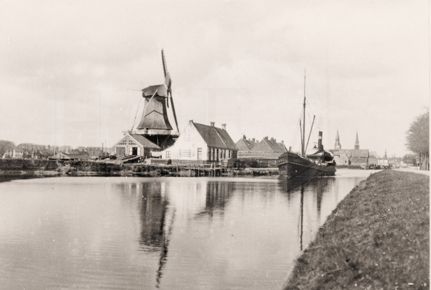 | Beschrijving: | Een schip komt uit de richting Franeker. Molen de Haan heeft zijn wieken nog. Zal in 1974 afbranden |