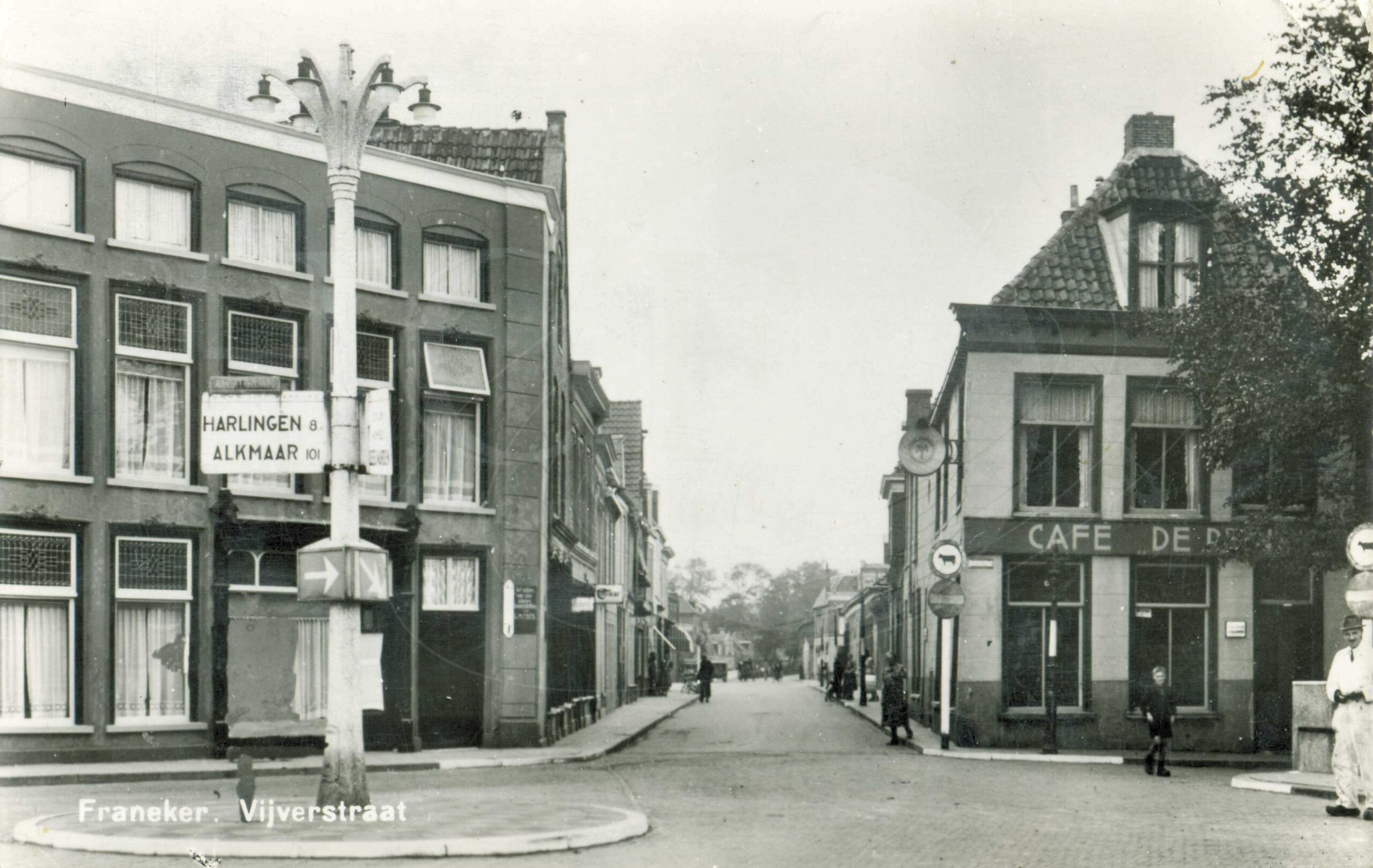 | Beschrijving: | Zicht op de Vijverstraat met links nummer 19 "De glaskast" genoemd. Recht het café "De Prins". |