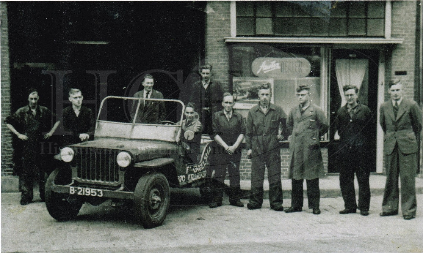 Beschrijving:Personeel van garage van Engels en Wijnia met de armen overelkaar Frans Stecking ( in de tweede wereldoorlog overgelopen duitser die later auto rijlessen zou geven). De jeep B- 21953 is van Simon Lieuwes Wijnia uit Wommels. Daarvoor van Tol. Nu de HEMA