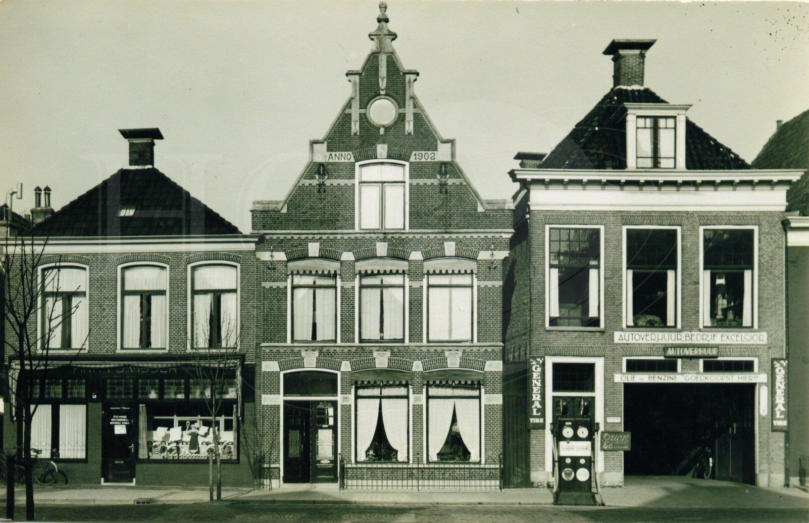 | Beschrijving: | Links de winkel van de weduwe van Yme Visser. Zoon Catharines zal hier later een grossierderij beginnen. Rechts de garage van Egbert Buwalda. Lange tijd zat hier de rijwielhandel van de Jong |