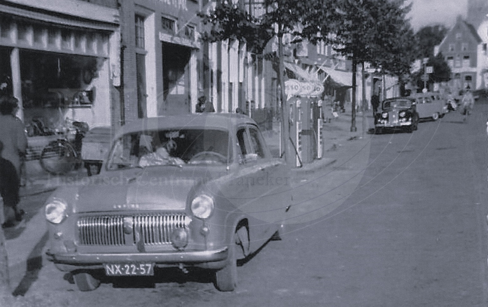 Beschrijving:Voorstraat met links de Rijwielhandelaar De Jong en daarnaast de Garage van Van der Pol.