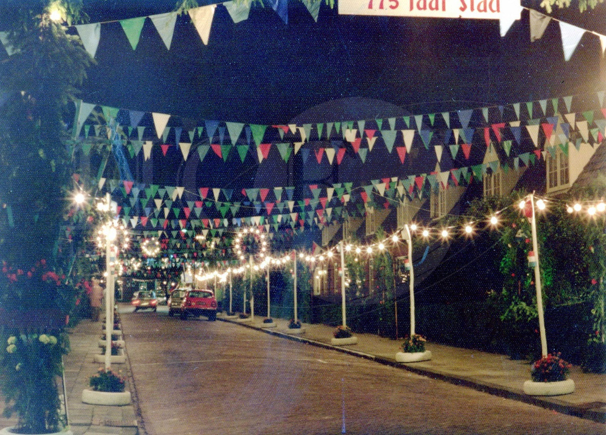 | Beschrijving: | Feest. Versierde straat in Franeker tijdens 775 jaar stad Franeker |