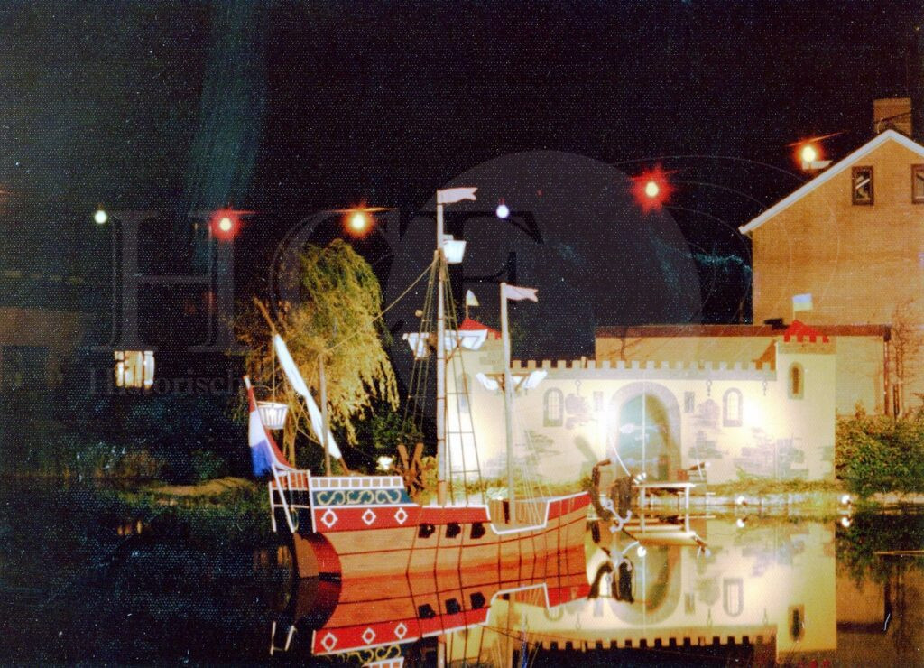 Beschrijving:Feest. Een Piratenschip in het water bij Michiel Miedemastraat in Franeker tijdens 775 jaar stad Franeker,