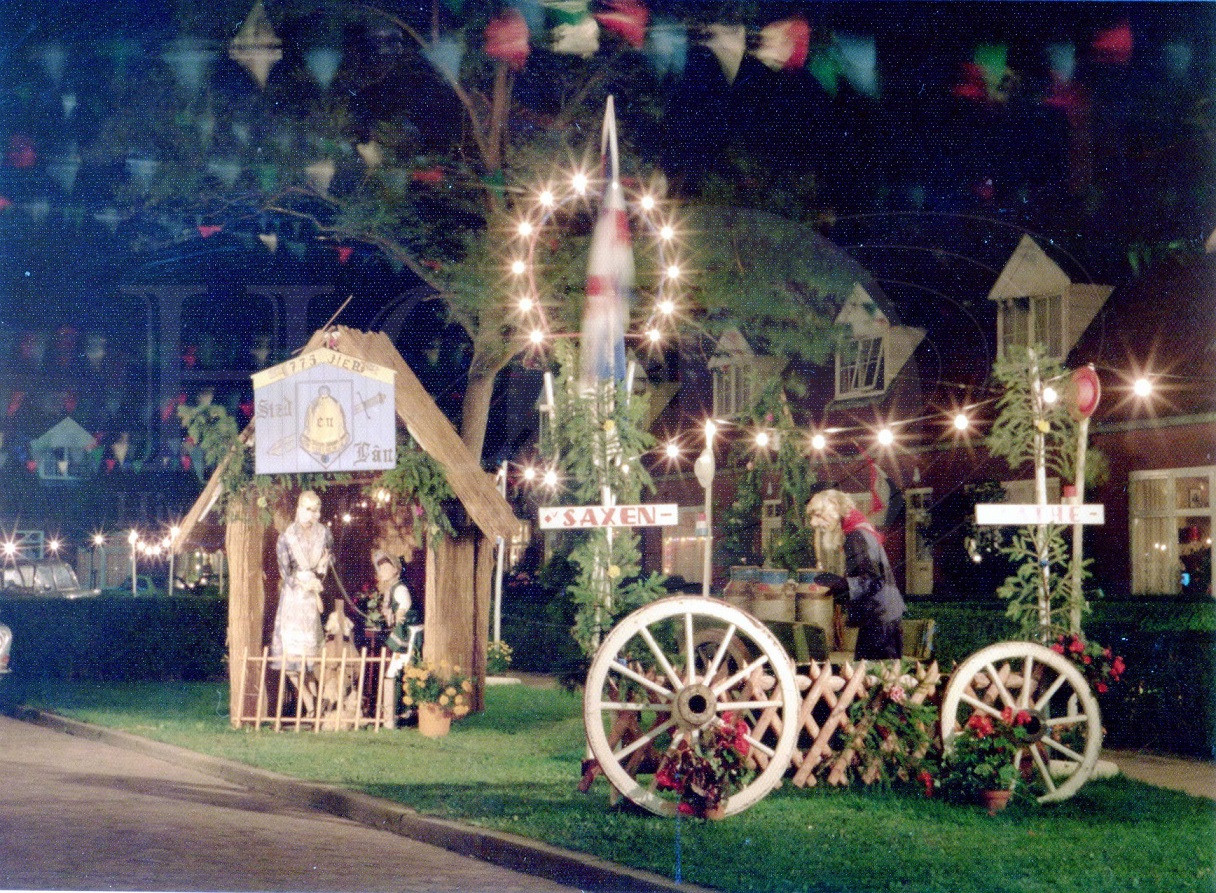 | Beschrijving: | Feest. Versierde straat in Franeker tijdens 775 jaar stad Franeker |