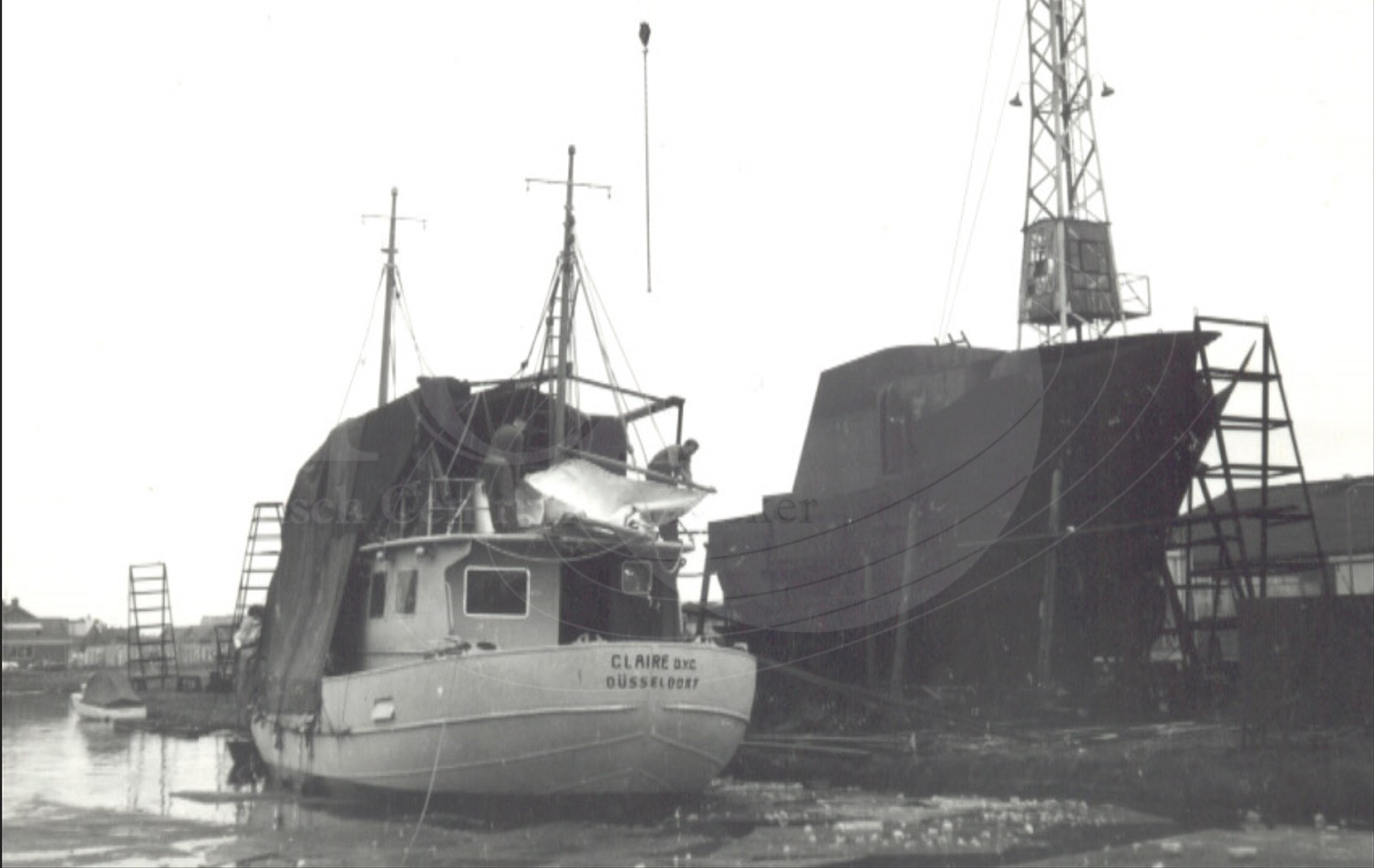 | Beschrijving: | De 'Claire' uit Düsseldorf ligt voor de kade om afgebouwd te worden.. Een schip in aanbouw ligt op de kade |