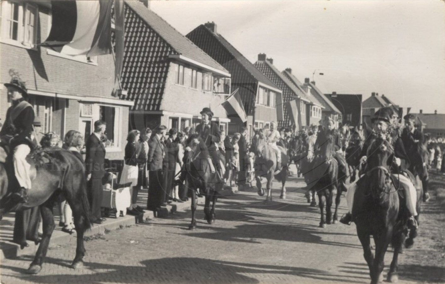 | Beschrijving: | Feest. Een optocht van de Sjaerdema ruiters op de Ypeijsingel. |