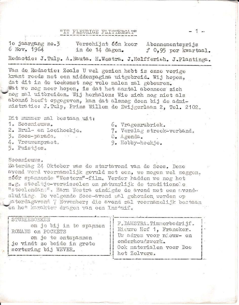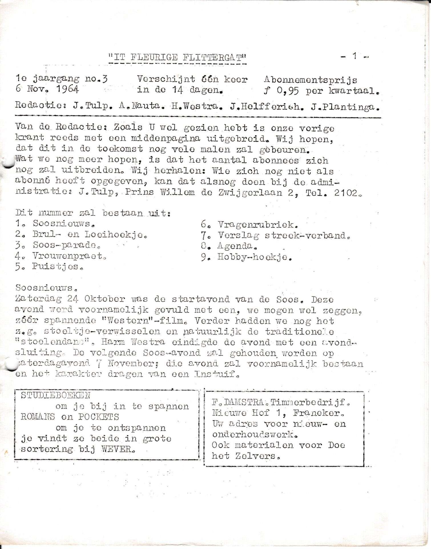 | Beschrijving: | It Fleurige Filttergat: 1964 1ste jaargang nr. 3: Van de redactie, Inhoud, Soosnieuws, Reklame: Timmerbedrijf F.Damstra Nieuwe Hof 1, Boekhandel Wever Raadhuisplein 6 |