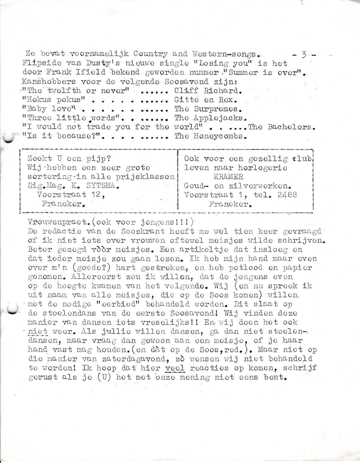| Beschrijving: | It Fleurige Filttergat: 1964 1ste jaargang nr. 3: vervolg Muziekrubriek de Soos-Parade, Vrouwenpraat, Reklame: Sigaren Magazijn K.Sijtsma Voorstraat 12, Horlogerie Kramer Voorstraat 1. |