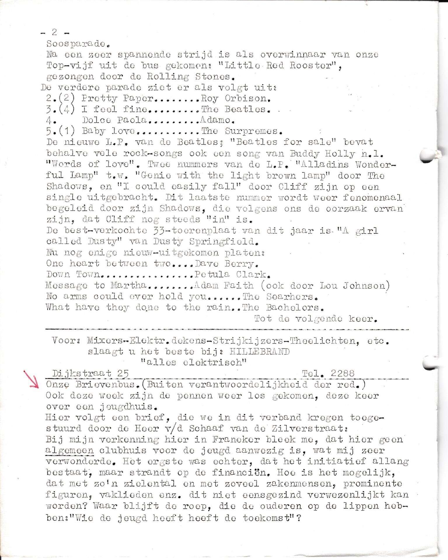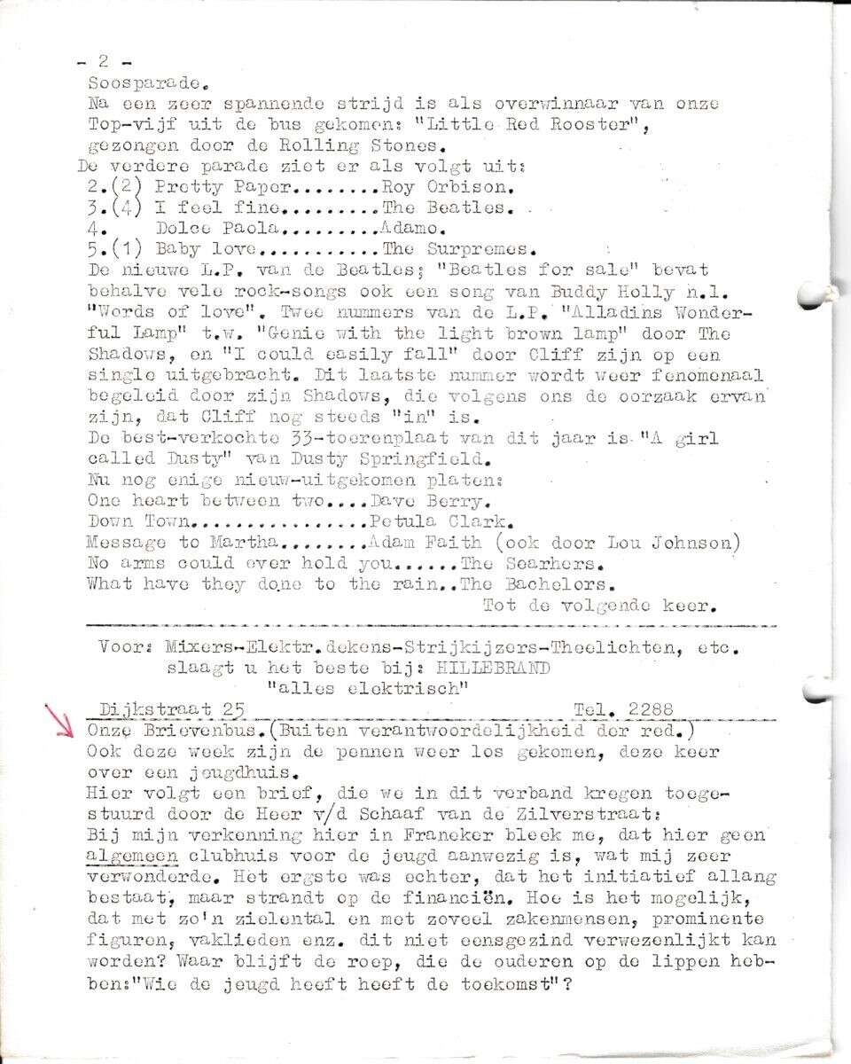 | Beschrijving: | It Fleurige Flittergat: 1ste jaargang nr. 6: Soosparade, Brievenbus: Reklame: Hillebrand "Alles Electrisch" Dijkstraat 25 |