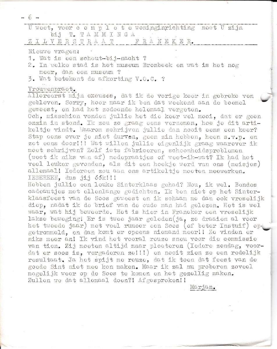 Beschrijving:It Fleurige Flittergat: 1ste jaargang nr. 6: vervolg vragenrubriek, Vrouwenpraat, Reklame: Woning Inrichting Tamminga Zilverstraat 3,