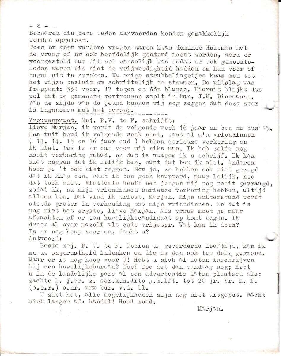 | Beschrijving: | It Fleurige Filttergat: 1ste jaargang nr. 8: vervolg Kerkvergadering: benoeming Dominee, Vrouwenpraat. |