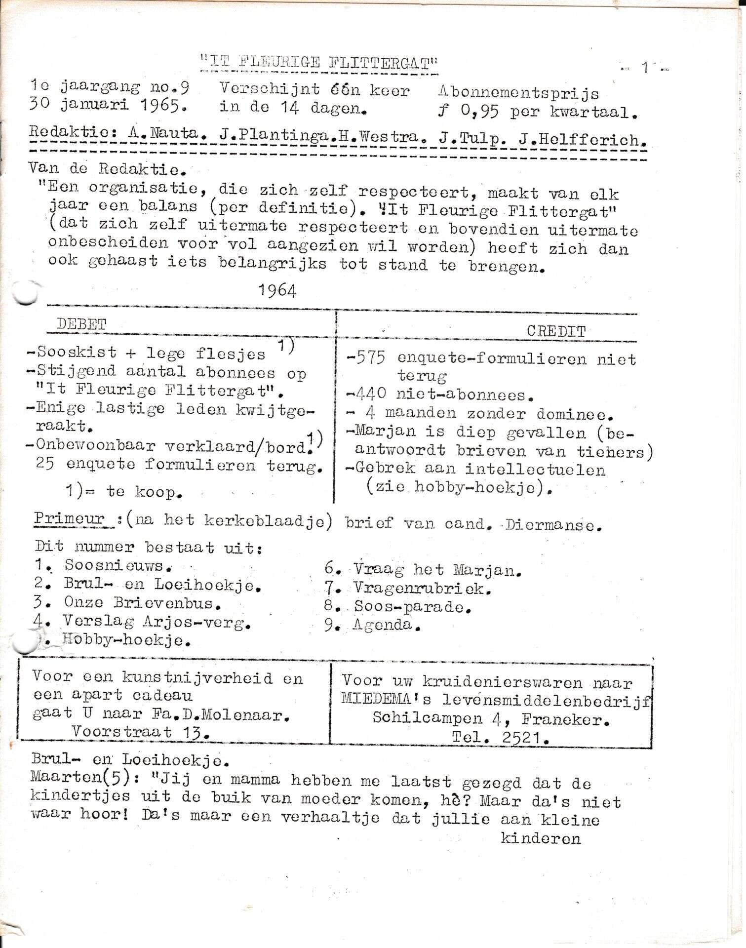 | Beschrijving: | It Fleurige Filttergat: 1ste jaargang nr. 9: van de Redactie, Debet/Credit (Ludiek), Inhoud, Brul en Loeihoekje. reklame: Fa.D.Molenaar Voorstaat 13, Kruidenier Miedema Schilcampen 4, |