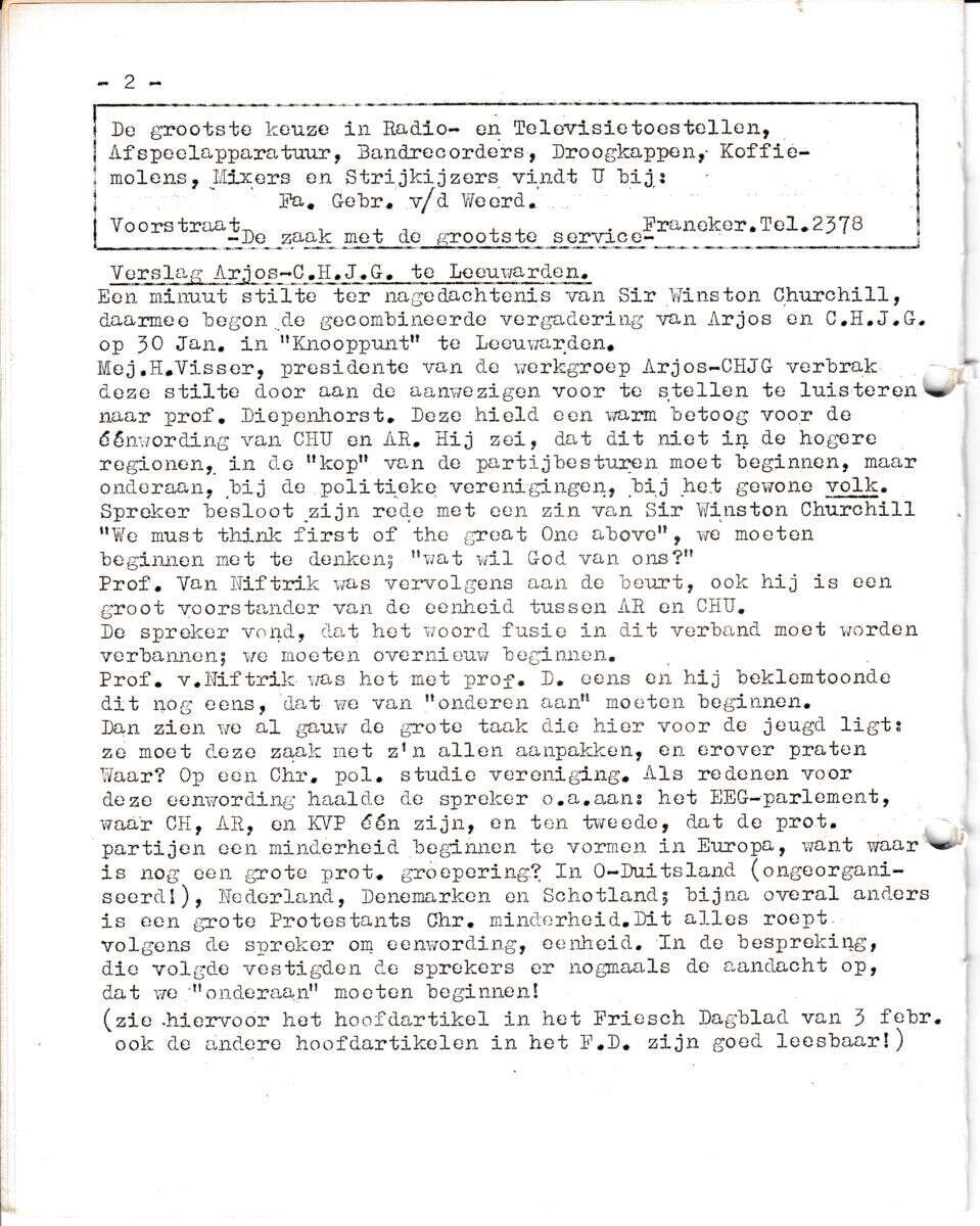 | Beschrijving: | It Fleurige Flittergat: 1ste jaargang nr. 10: ARJOS - CHJG vergadering, Reklame: Gebr. Van der Weert Voorstraat 25 |