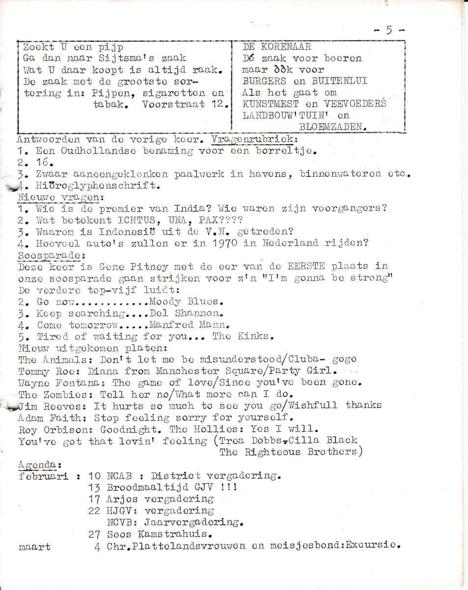 | Beschrijving: | It Fleurige Flittergat: 1ste jaargang nr. 10: Vragenrubriek, Soosparade, Agenda, Reklame: Sigaren Magazijn K.Sijtsma Voorstraat 12, De Korenaar Zilverstraat 58. |