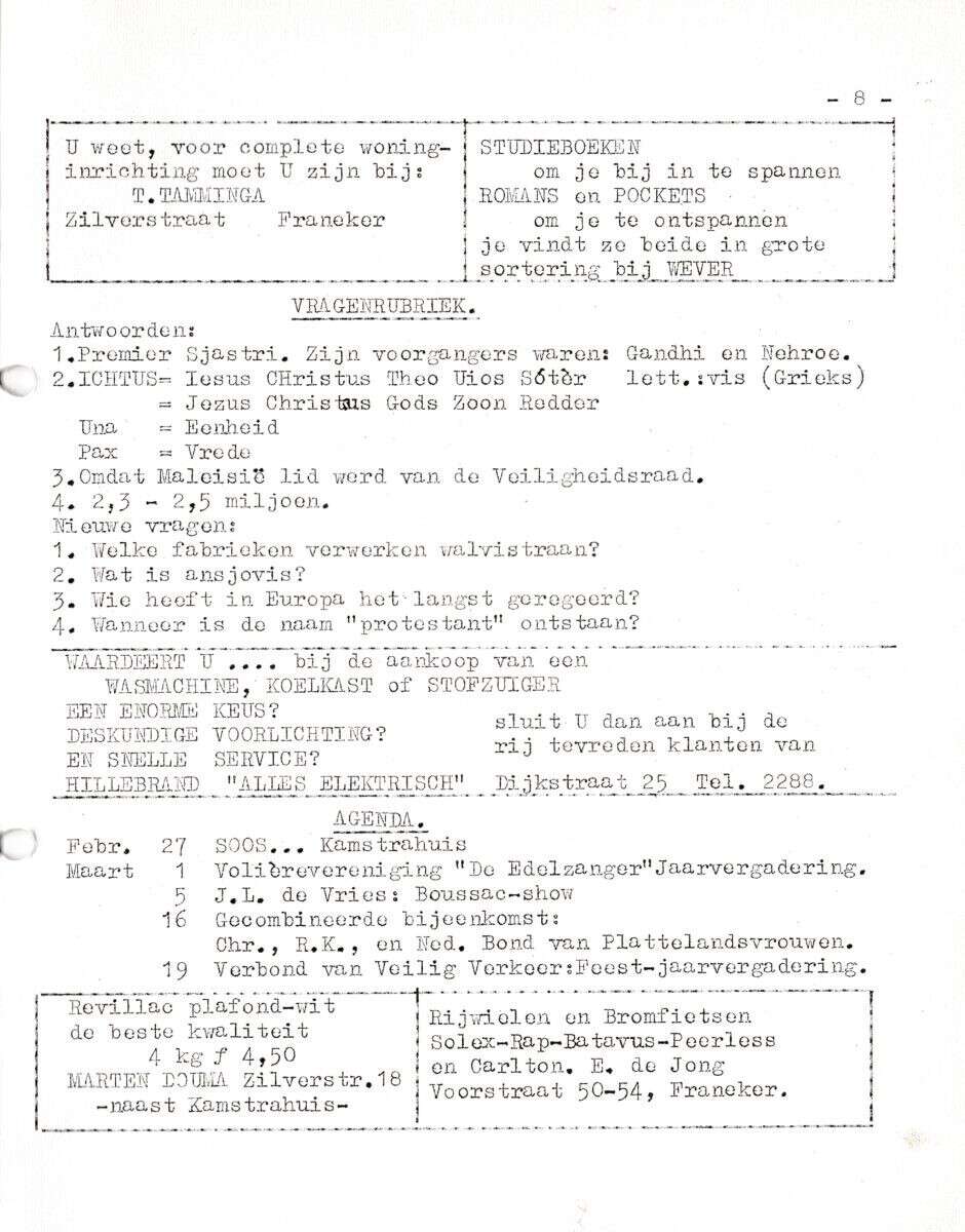 | Beschrijving: | It Fleurige Flittergat: 1ste jaargang nr. 11: Vragenrubriek, Agenda, Reklame: Woning Inrichting Tamminga Zilverstraat 3, Boekhandel Wever Raadhuisplein 6, Hillebrand "Alles Electrisch" Dijkstraat 25, Rijwielhandel E.de Jong voorstraat 50-54, Schilder Marten Douma, Zilverstraat 18 |