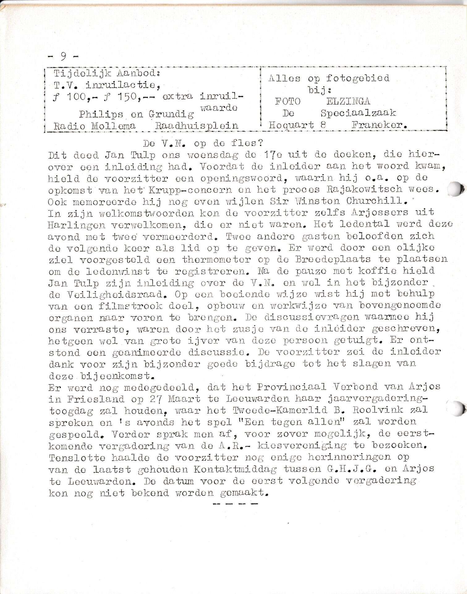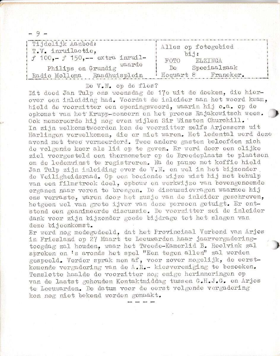 | Beschrijving: | It Fleurige Flittergat: 1ste jaargang nr. 11: ARJOS Reklame: Radio Mollema, Raadhuisplein 2, Foto Elsinga Hocquart 8 |
