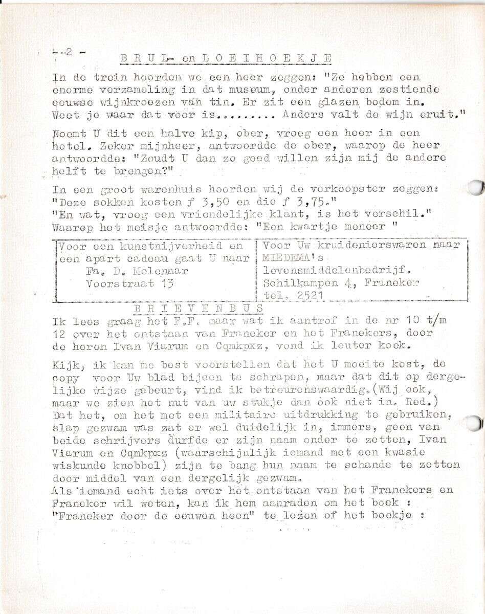 | Beschrijving: | It Fleurige Flittergat: 1ste jaargang nr. 13: Brul en Loeihoekje,Brievenbus:Hoe is het Franekers ontstaan?,Reklame: Fa.D.Molenaar Voorstaat 13, Kruidenier Miedema Schilcampen 4 |