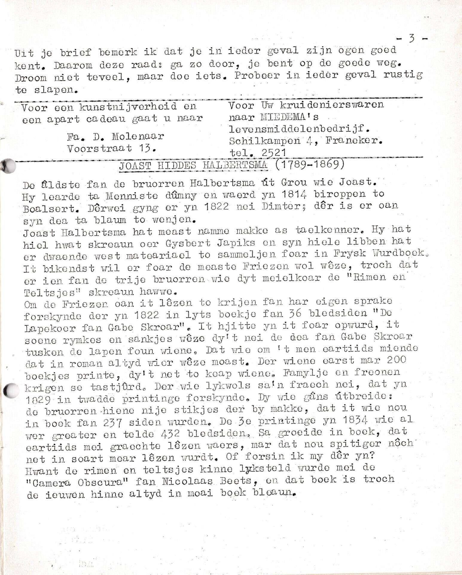 | Beschrijving: | It Fleurige Flittergat: 1ste jaargang nr. 15: Joost Hiddes Halbertsma, Reklame: Fa.D.Molenaar Voorstaat 13, Kruidenier Miedema Schilcampen 4 |