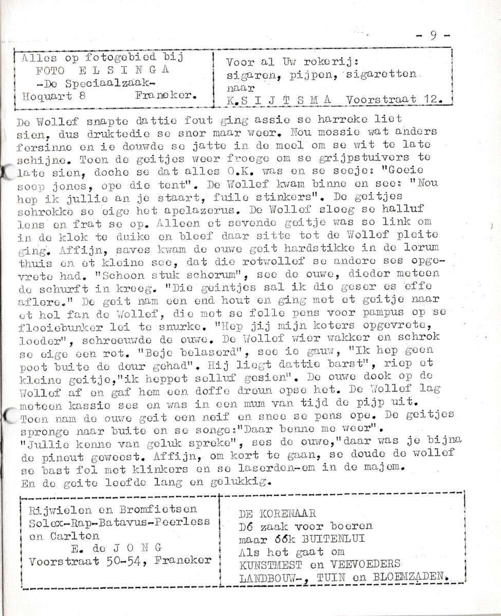 | Beschrijving: | It Fleurige Flittergat: 1ste jaargang nr. 15: vervolg De Wolf en de zeven geitjes, Reklame: Sigaren Magazijn K.Sijtsma, Voorstraat 12, Foto Elsinga Hocquart 8, De Korenaar Zilverstraat 58, Rijwielhandel E.de Jong voorstraat 50-54. |