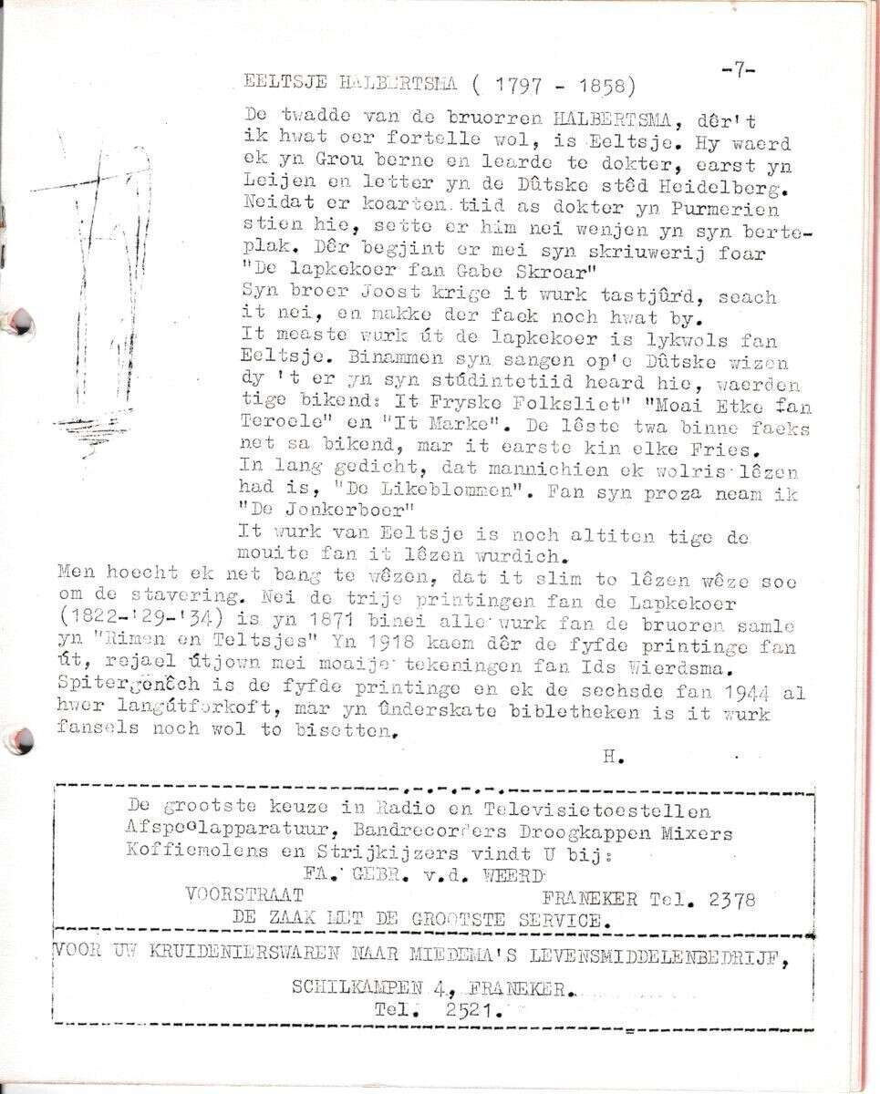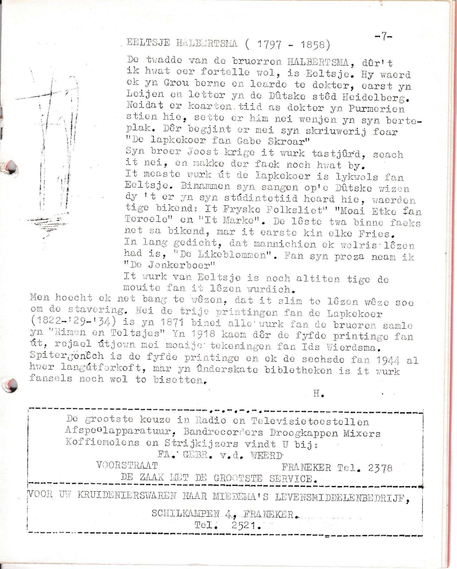 | Beschrijving: | It Fleurige Flittergat: 1ste jaargang nr. 16: Eeltsje Halbertsma, Reklame: Gebr. Van der Weert Voorstraat 25, Kruidenier Miedema Schilcampen 4 |