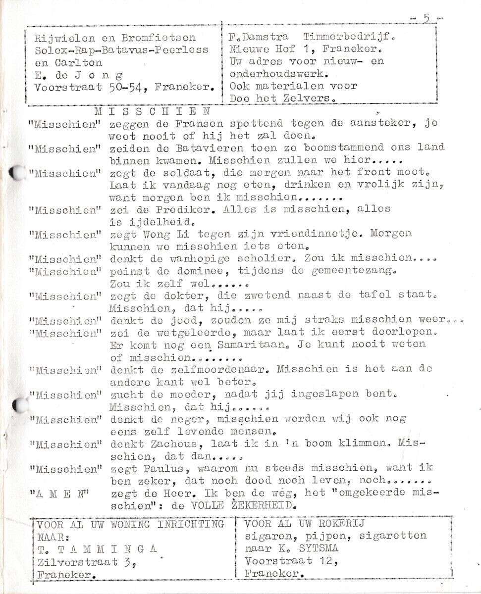 Beschrijving:It Fleurige Flittergat: 1ste jaargang nr. 18: Misschien. Reklame: Sigaren Magazijn K.Sijtsma, Voorstraat 12, Woning Inrichting Tamminga Zilverstraat 3, Rijwielhandel E.de Jong voorstraat 50-54, Timmerbedrijf F.Damstra Nieuwe Hof 1.