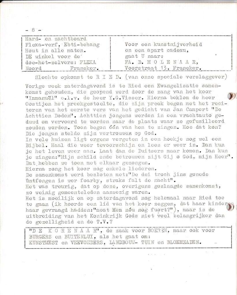 Beschrijving:It Fleurige Flittergat: 1ste jaargang nr. 19: Evangelisatie samenkomst te Ried. Reklame: Flexa Noord 38, Fa.D.Molenaar Voorstaat 13, De Korenaar Zilverstraat 58.
