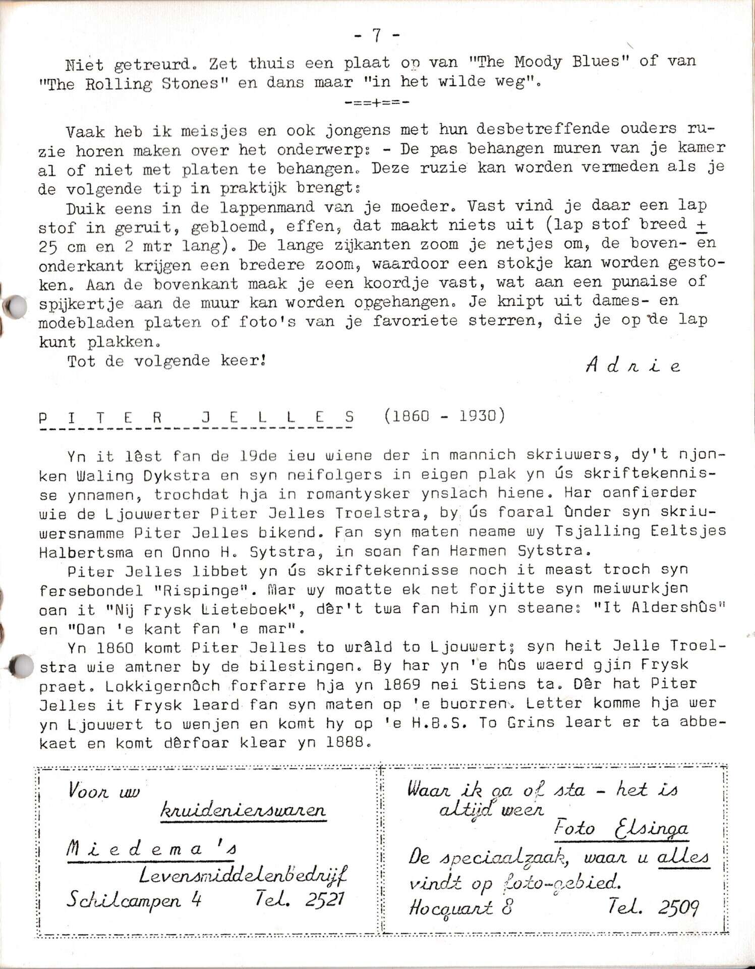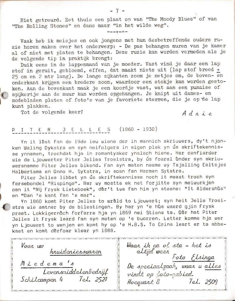 Beschrijving:It Fleurige Flittergat: 2de jaargang nr. 1: vervolg Vrouwenpraat, Pieter Jelles, Reklame: Miedema Kruidenier Schilcampen 4, Foto Elsinga Hocquart 8.