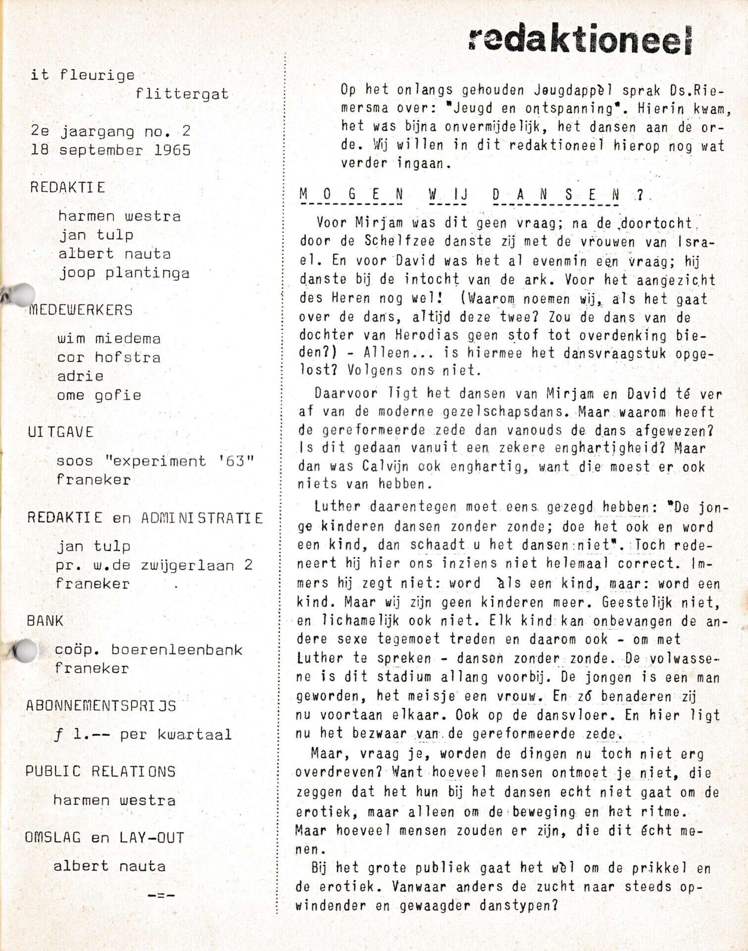 Beschrijving:It Fleurige Flittergat: 2de jaargang nr. 2: Redactioneel "Mogen wij dansen"