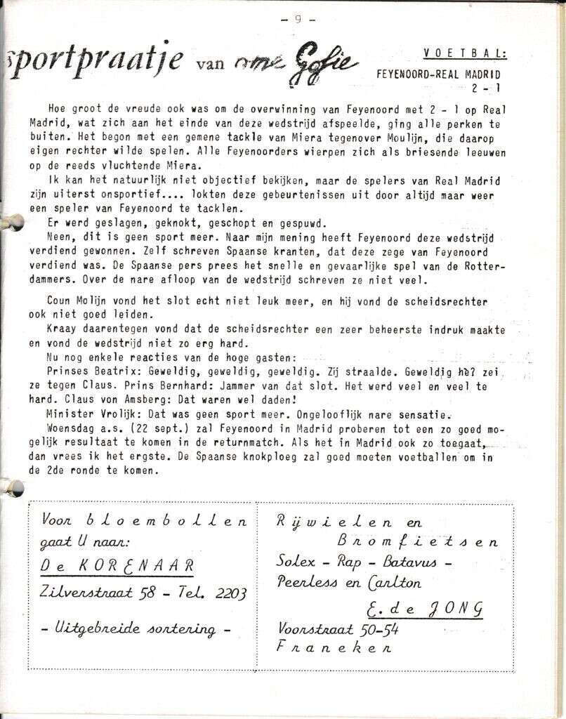 | Beschrijving: | It Fleurige Flittergat: 2de jaargang nr. 2: Sportpraat voetbal Feyenoord-Real Madrid, Reklame: De Korenaar Zilverstraat 58, Rijwielhandek E.de Jong. Voorstraat 50,52,54 |
