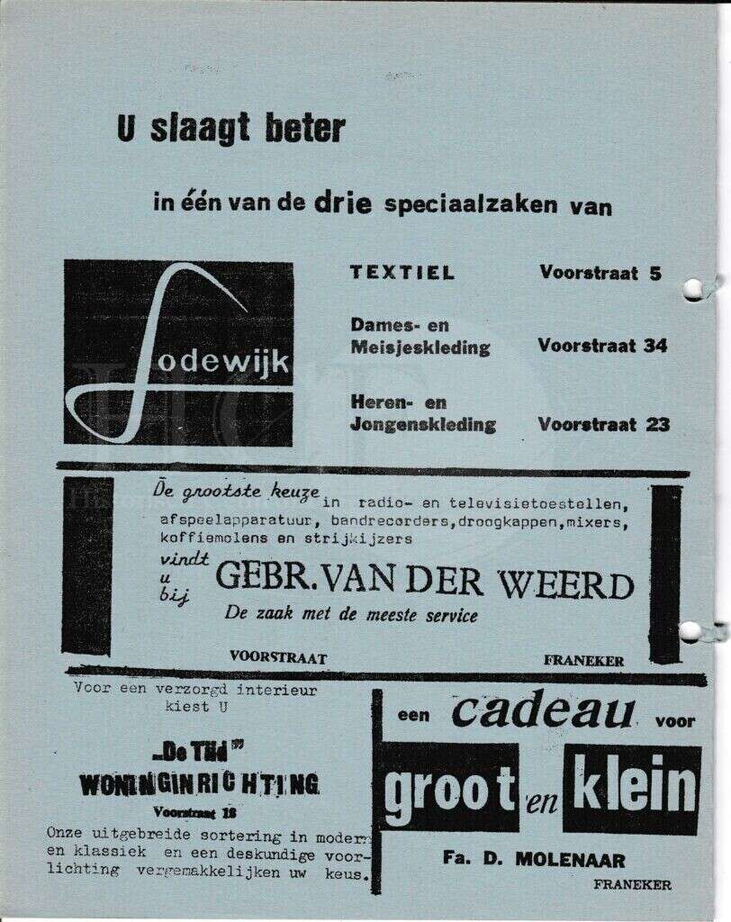| Beschrijving: | It Fleurige Flittergat: 2de jaargang nr. 3: Reklame: Lodewijk Textiel en kleding Voorstraat 5,23 en 34, Gebr. Van der Weert Voorstraat 25, Woning inrichting "De Tijd" Voorstraat 18, Fa.D.Molenaar Voorstaat 13 |