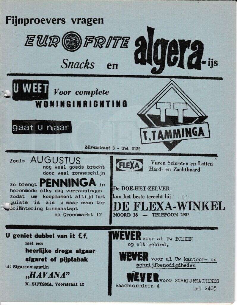 | Beschrijving: | It Fleurige Flittergat: 2de jaargang nr. 3: Cafetaria Algera Waagstraat 22, Woninginrichting T.Tamminga Zilverstraat 3, Herenmode Penninga Groenmarkt 12, De Flexa Noord 38, Sigarenmagazijn"Havana" K.Sijtsma Voorstraat 12, Boekhandel Wever Raadhuisplein 4. |
