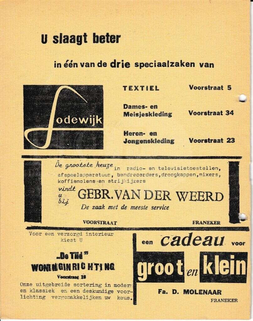 | Beschrijving: | It Fleurige Flittergat: 2de jaargang nr. 4: Lodewijk Textiel en kleding Voorstraat 5, 23 en 34, Gebr. Van der Weert Voorstraat 25, Woning inrichting "De Tijd" Voorstraat 18, Fa.D.Molenaar Voorstaat 13 |
