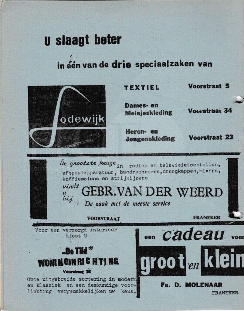 Beschrijving:It Fleurige Flittergat: 2de jaargang nr. 6: Reklame; Lodewijk Textiel en kleding Voorstraat 5,23 en 34, Gebr. Van der Weert Voorstraat 25, Woning inrichting "De Tijd" Voorstraat 18, Fa.D.Molenaar Voorstaat 13