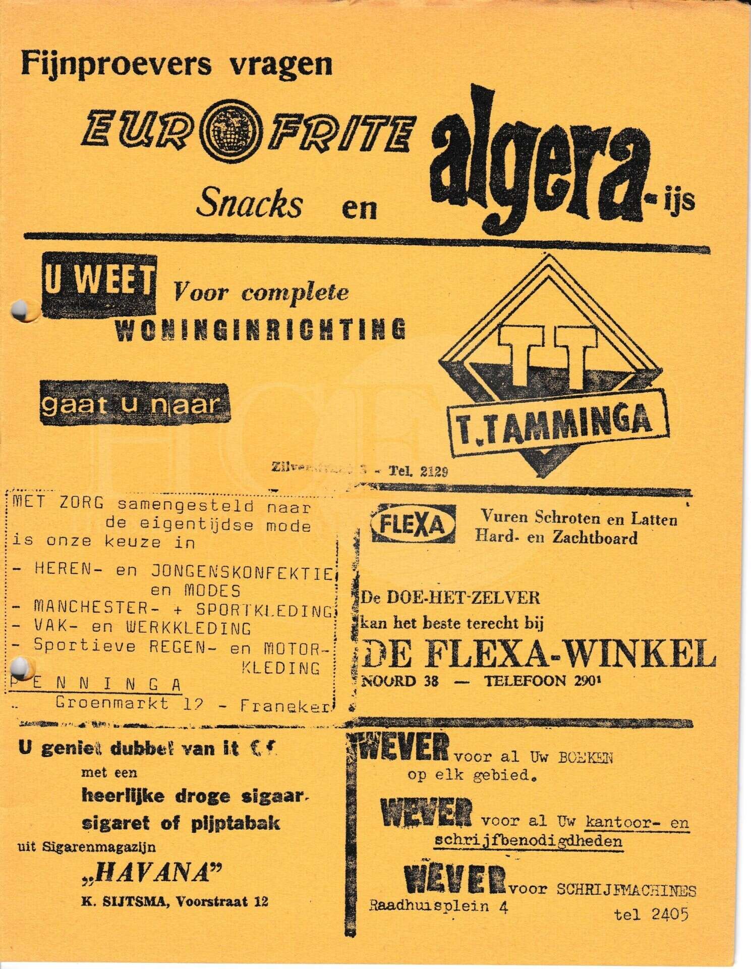 | Beschrijving: | It Fleurige Flittergat: 2de jaargang nr 7. : Reklame; Cafetaria Algera Waagstraat 22, Woninginrichting T.Tamminga Zilverstraat 3, Herenmode Penninga Groenmarkt 12, De Flexa Noord 38, Sigarenmagazijn"Havana" K.Sijtsma Voorstraat 12, Boekhandel Wever Raadhuisplein 4. |