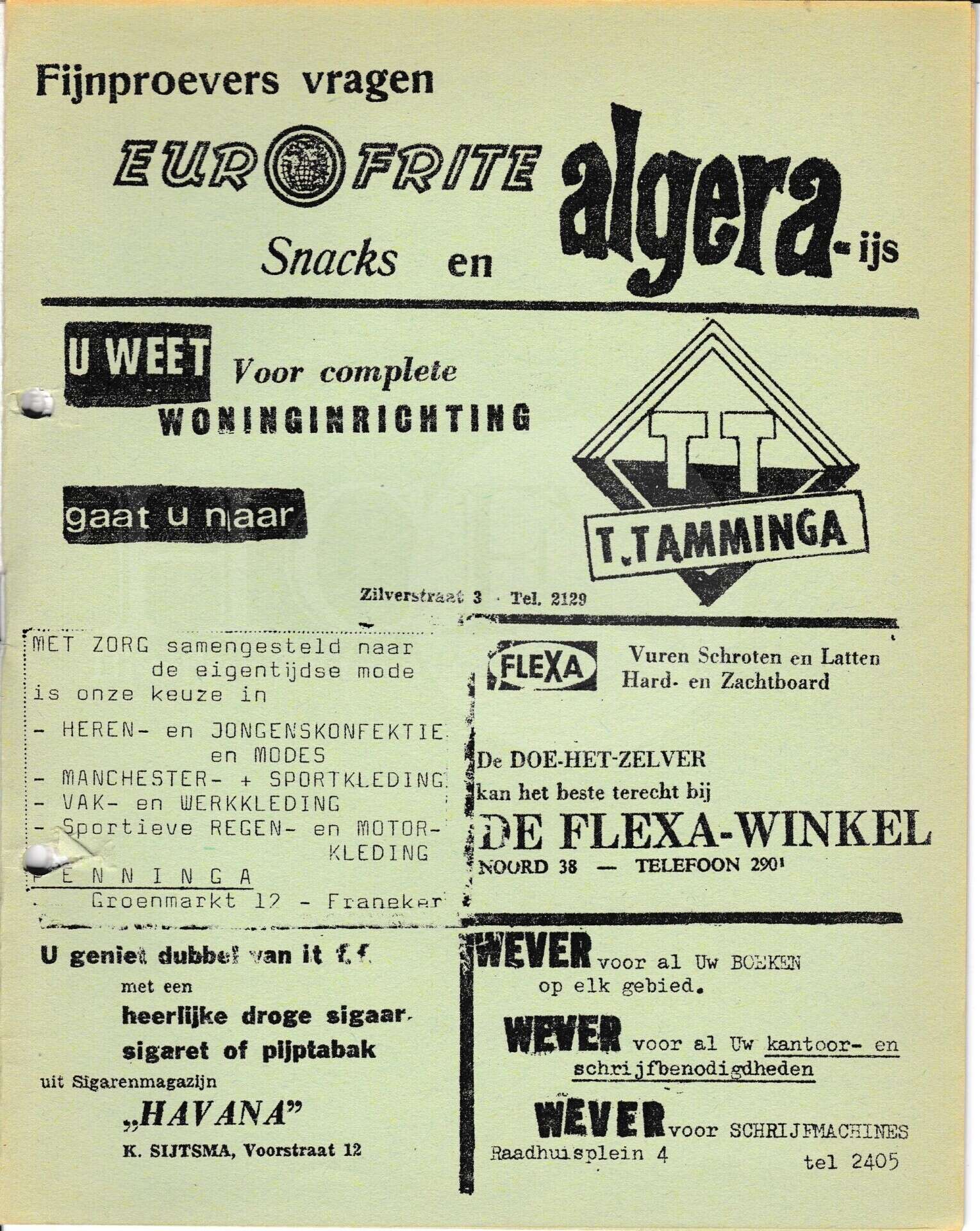 | Beschrijving: | It Fleurige Flittergat: 2de jaargang nr. 8: Reklame; Cafetaria Algera Waagstraat 22, Woninginrichting T.Tamminga Zilverstraat 3, Herenmode Penninga Groenmarkt 12, De Flexa Noord 38, Sigarenmagazijn"Havana" K.Sijtsma Voorstraat 12, Boekhandel Wever Raadhuisplein 4. |