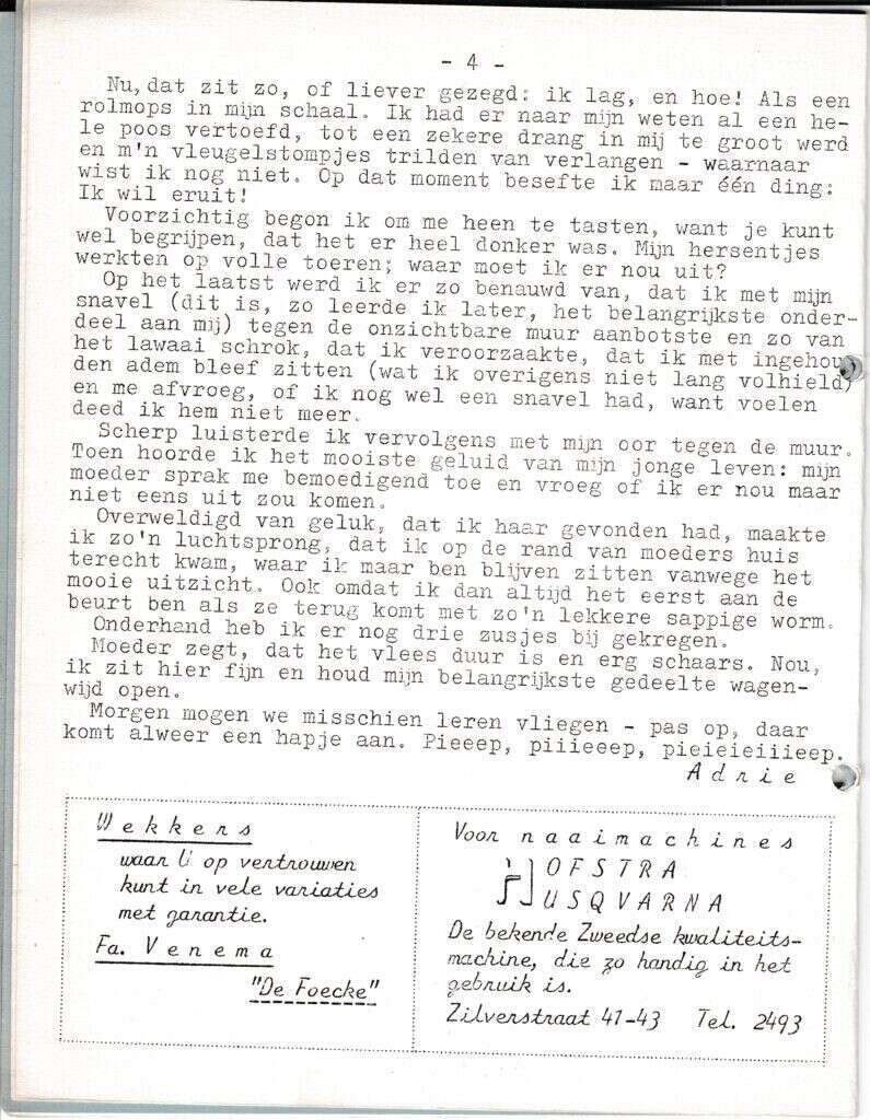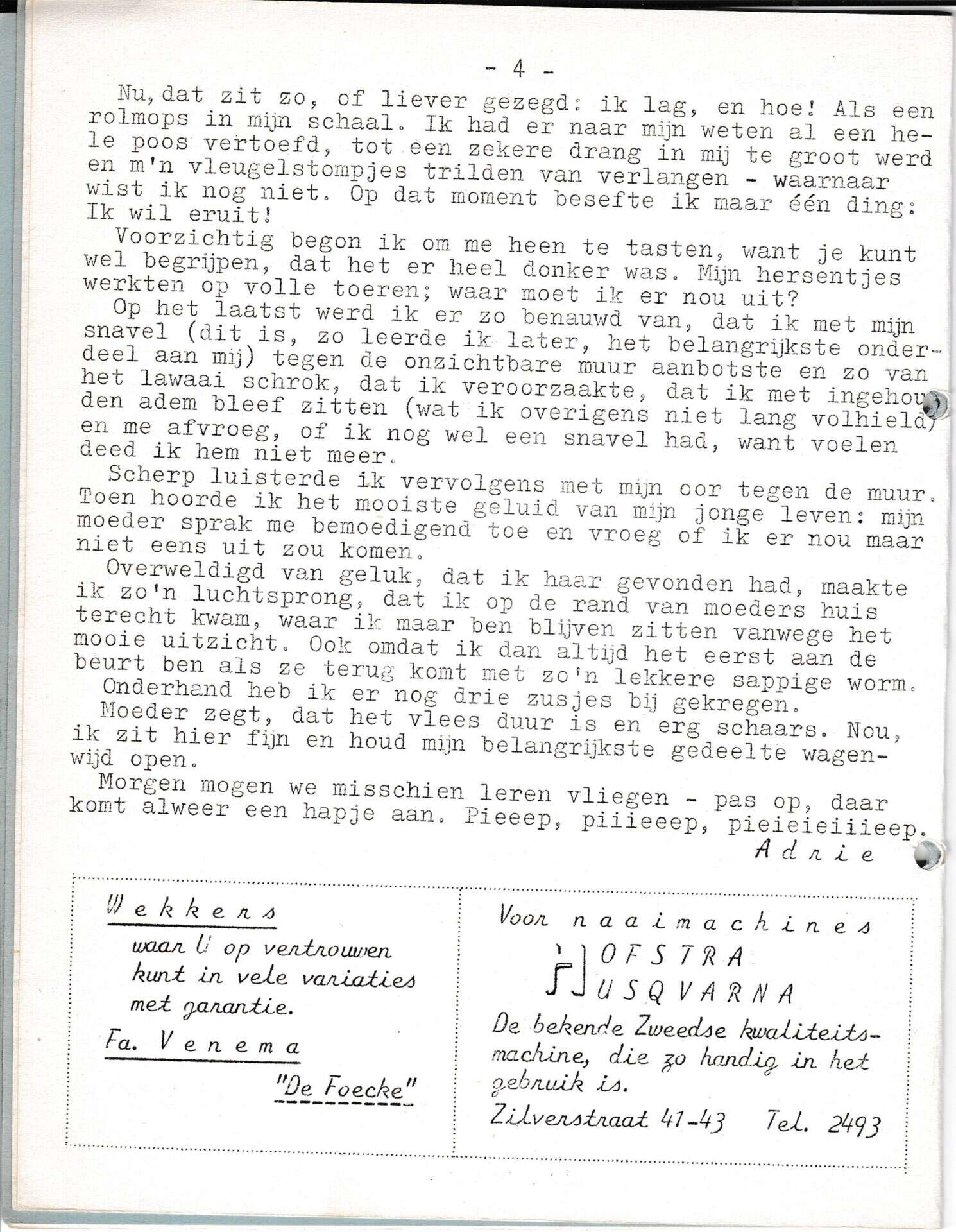 | Beschrijving: | It Fleurige Flittergat: 2de jaargang nr. 12: vervolg De Tondeldoos. Reklame; Hofstra naaimachines Zilverstraat 41,43, Juwelier "De Foeke" Voorstraat 4 |