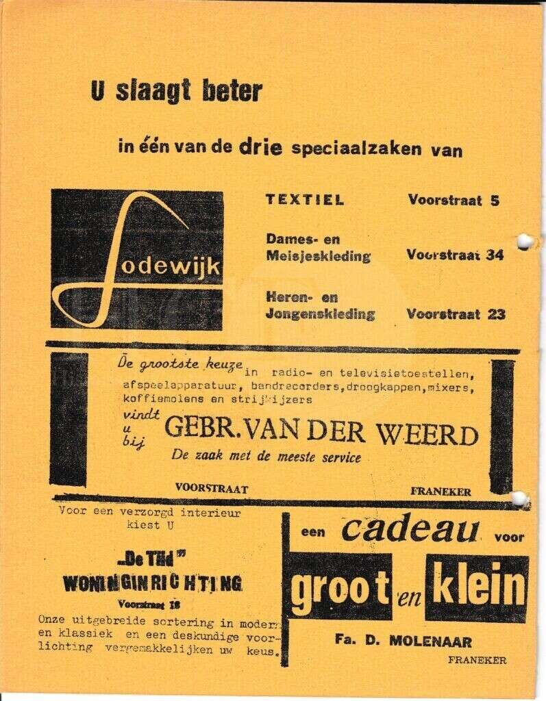 | Beschrijving: | It Fleurige Flittergat: 2de jaargang nr. 13: Reklame; Lodewijk Textiel en kleding Voorstraat 5,23 en 34, Gebr. Van der Weert Voorstraat 25, Woning inrichting "De Tijd" Voorstraat 18, Fa.D.Molenaar Voorstaat 13 |