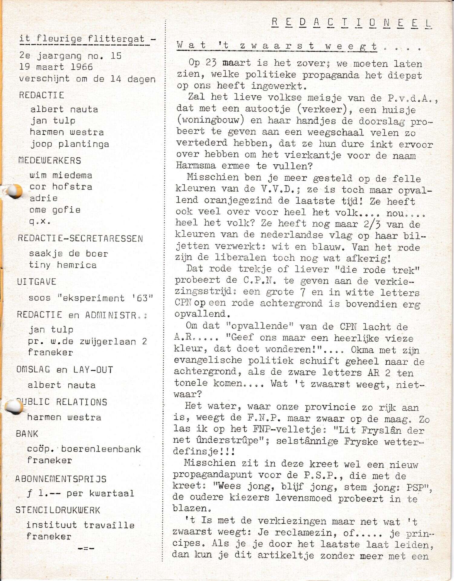 | Beschrijving: | It Fleurige Flittergat: 2de jaargang nr. 15: Redactioneel: wat het zwaarste weegt; verkiezingen |