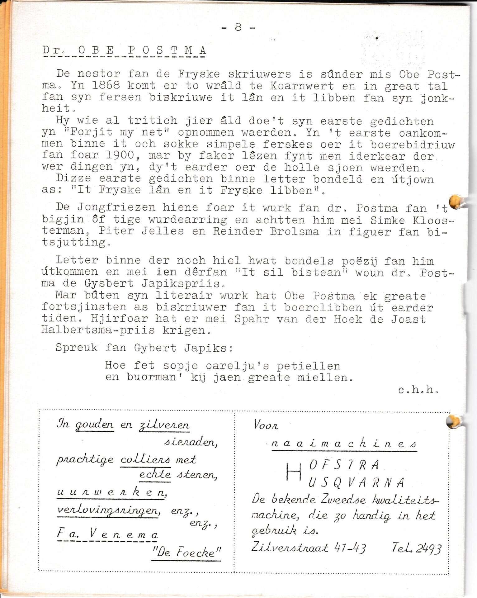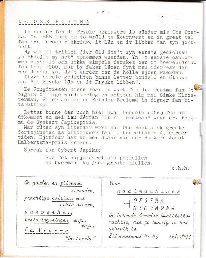 Beschrijving:It Fleurige Flittergat: 2de jaargang nr. 15: Dr. Obe Postma. Reklame; Hofstra naaimachines Zilverstraat 41,43, Juwelier "De Foeke" Voorstraat 4