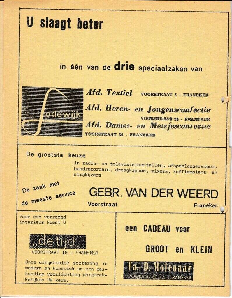Beschrijving:It Fleurige Flittergat: 2de jaargang nr. 16: Reklame; Lodewijk Textiel en kleding Voorstraat 5,23 en 34, Gebr. Van der Weert Voorstraat 25, Woning inrichting "De Tijd" Voorstraat 18, Fa.D.Molenaar Voorstaat 13
