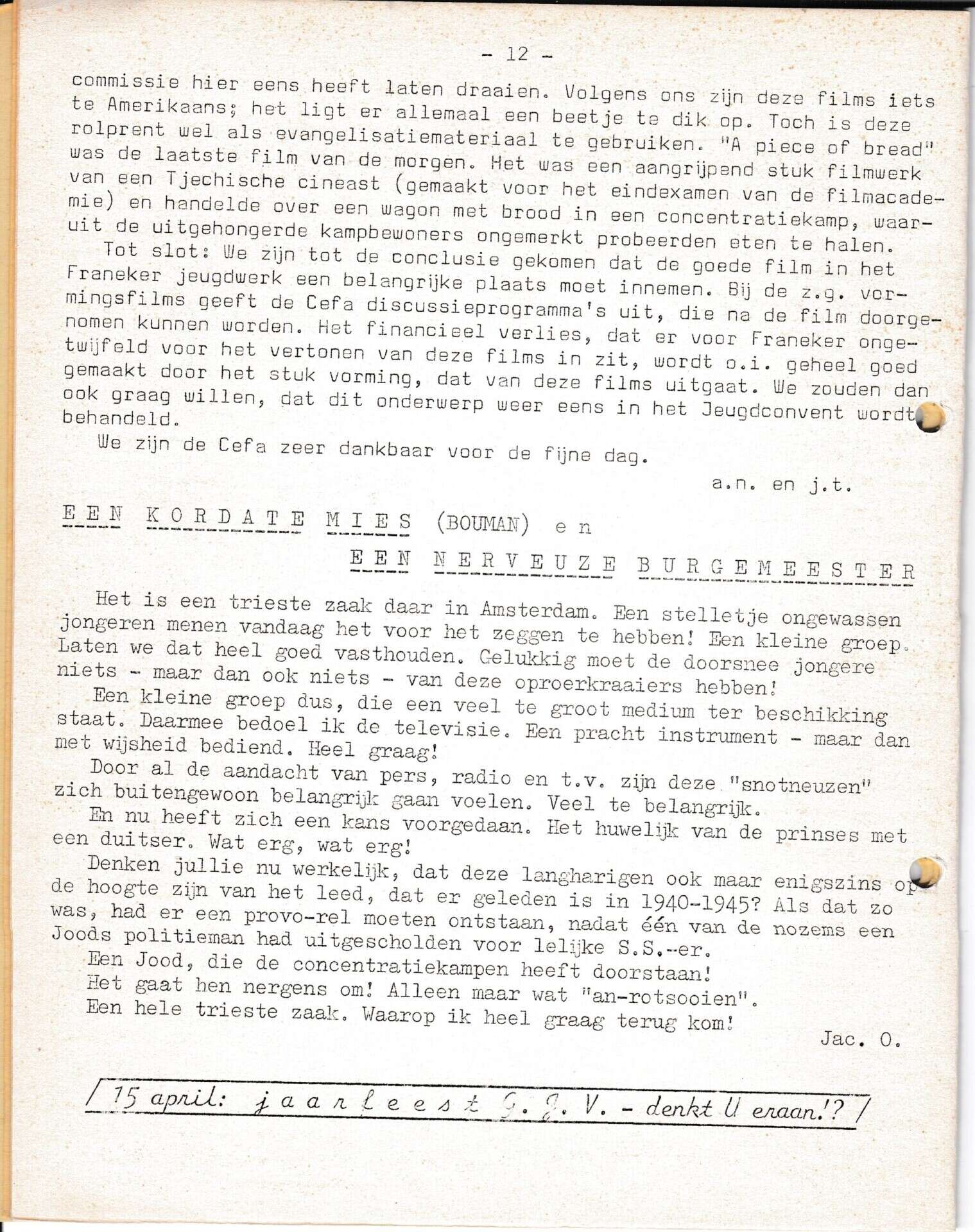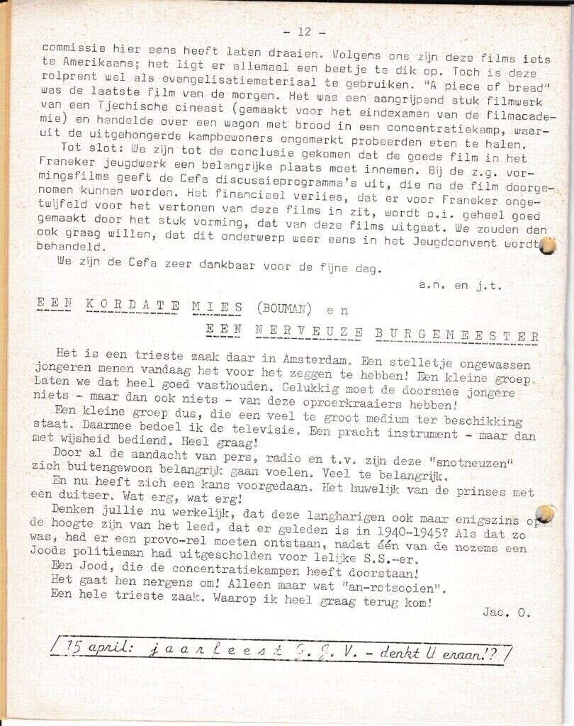 Beschrijving:It Fleurige Flittergat: 2de jaargang nr. 16: vervolg Filmbespreking; De slaap der rechtvaardigen, Televisie bespreking; Een kordate Mies (Bouman) en een nerveuze burgemeester.