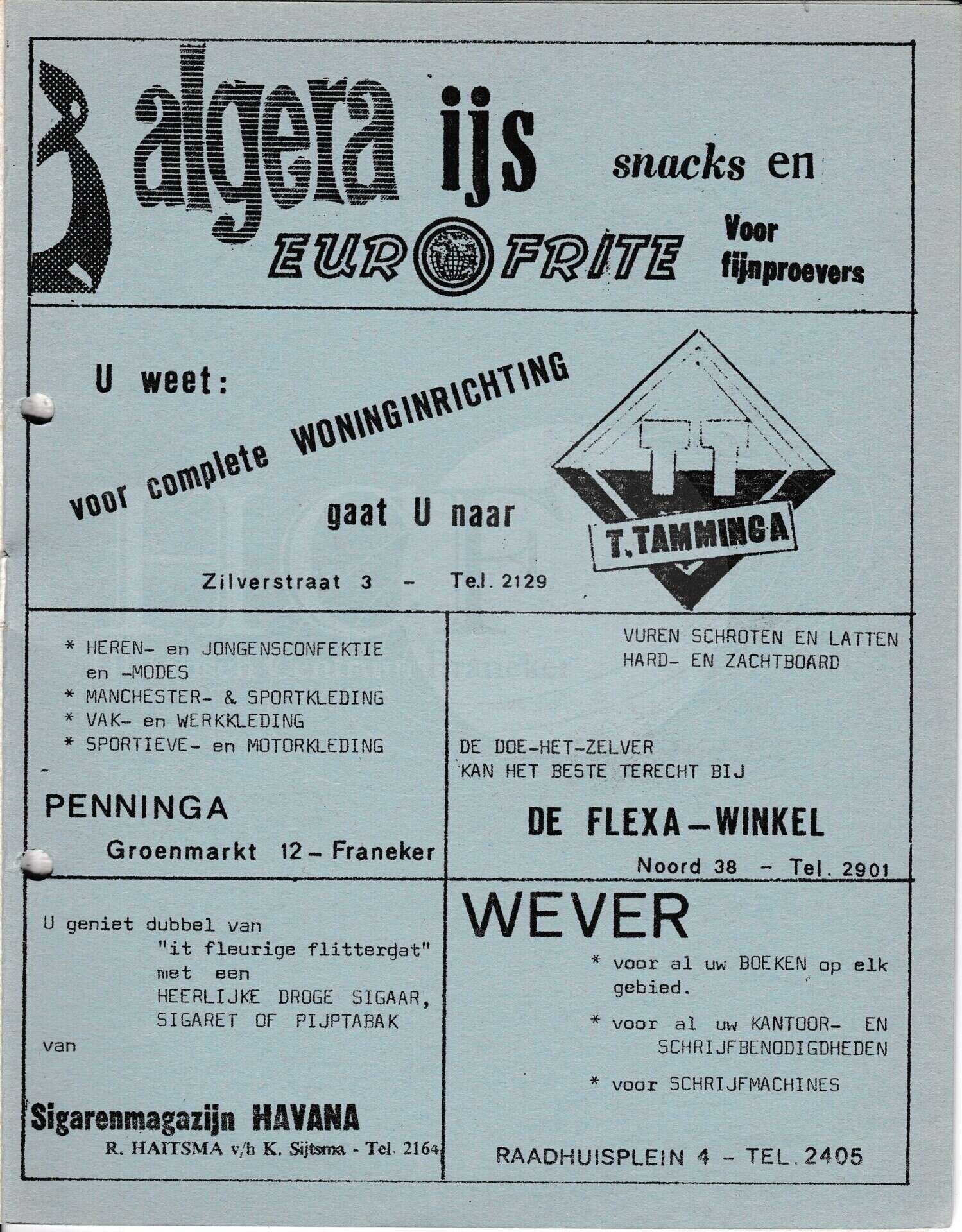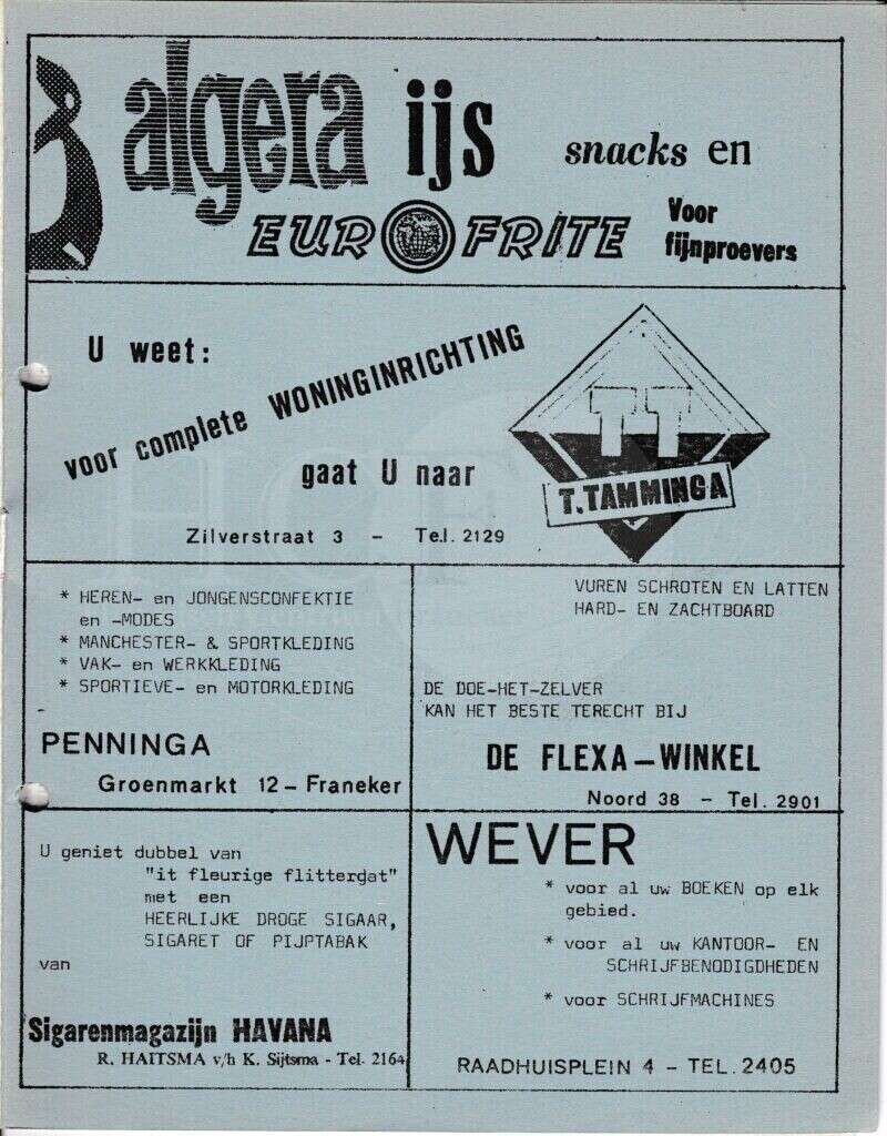 | Beschrijving: | It Fleurige Flittergat: 2de jaargang nr. 18: Reklame; Cafetaria Algera Waagstraat 22, Woninginrichting T.Tamminga Zilverstraat 3, Herenmode Penninga Groenmarkt 12, De Flexa Noord 38, Sigarenmagazijn"Havana" K.Sijtsma Voorstraat 12, Boekhandel Wever Raadhuisplein 4. |