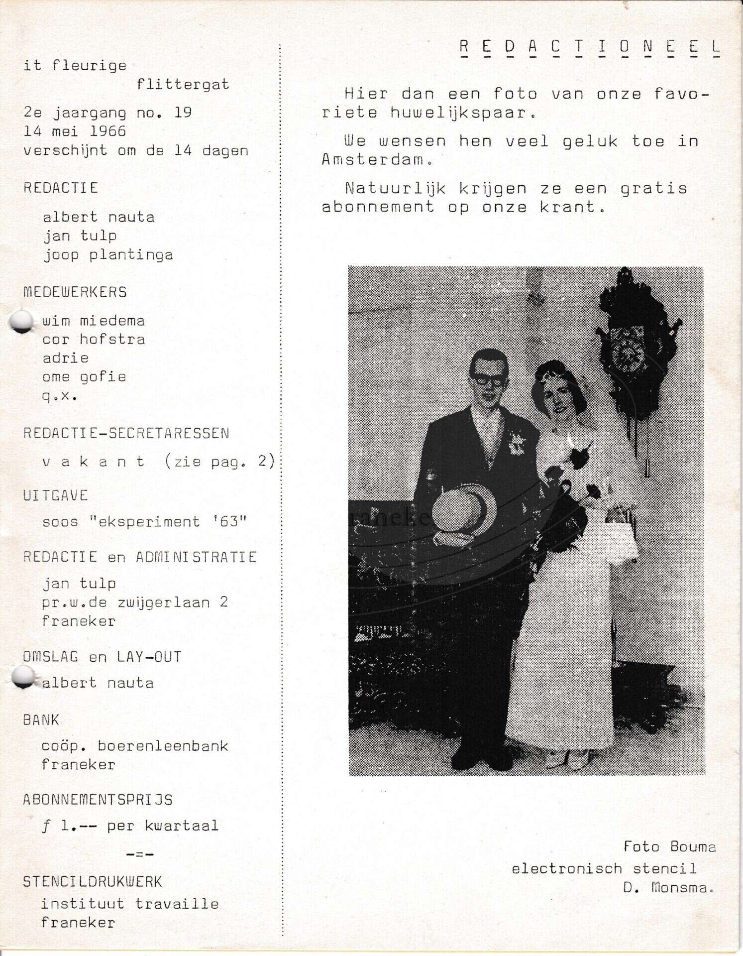 | Beschrijving: | It Fleurige Flittergat: 2de jaargang nr. 19: Redactioneel: Foto bruidspaar |